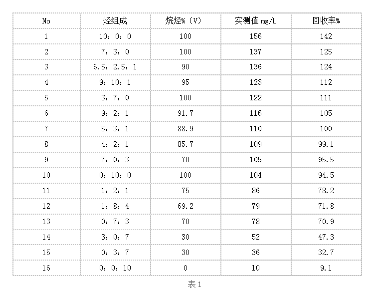 非分散紅外法以石油類物質(zhì)的CH3、 CH2在3.3~3.6 μm 的特征吸收作為測定油含量的基礎(chǔ)。該法只利用了礦物油中CH3、 CH2兩個(gè)特性基團(tuán)的紅外吸收進(jìn)行測定,沒有參考其中芳環(huán)的響應(yīng),存在“以偏概全”之不足。為考察應(yīng)用中的局限性,用不同配比甚至極端比例的混合烴進(jìn)行試驗(yàn),結(jié)果見表1。